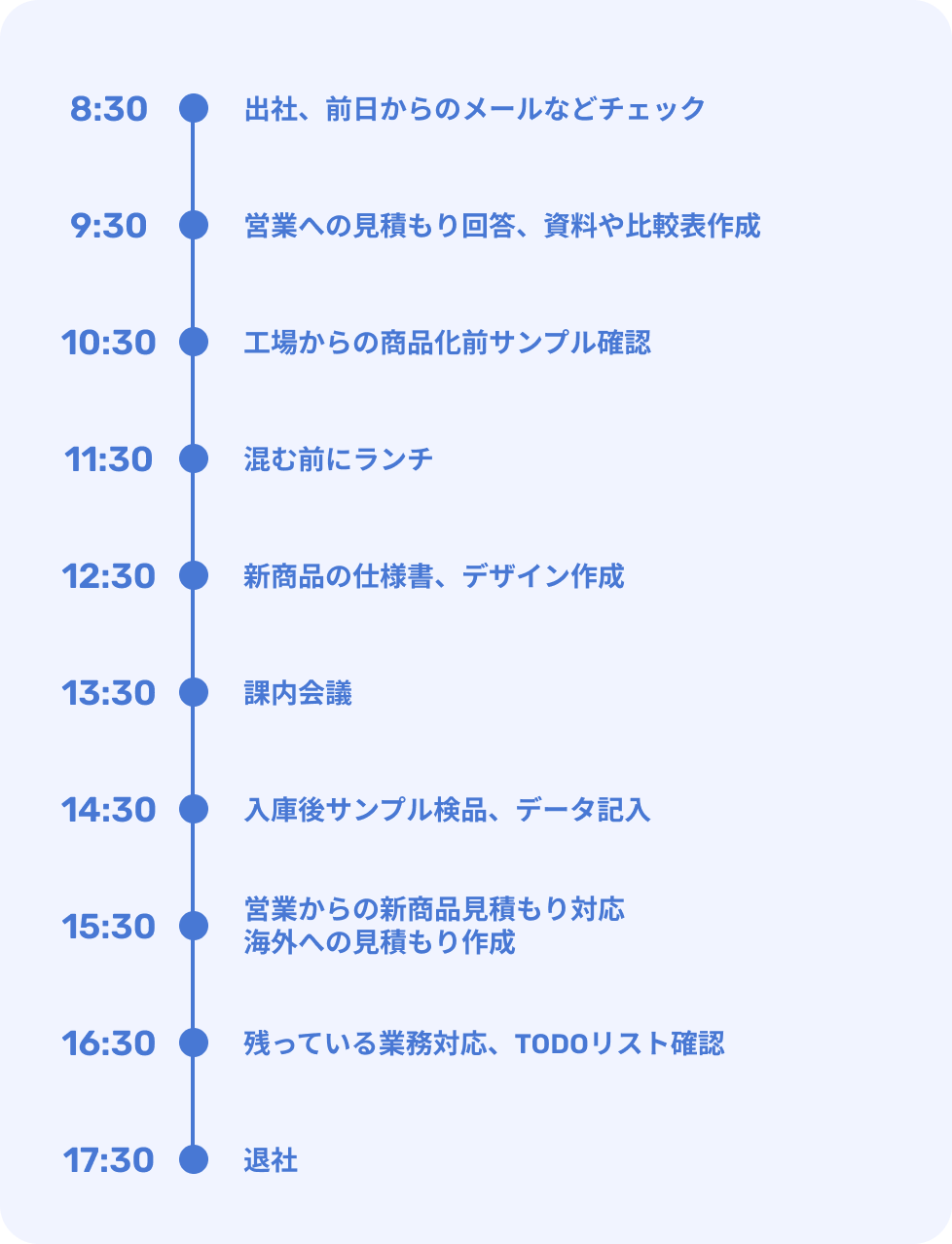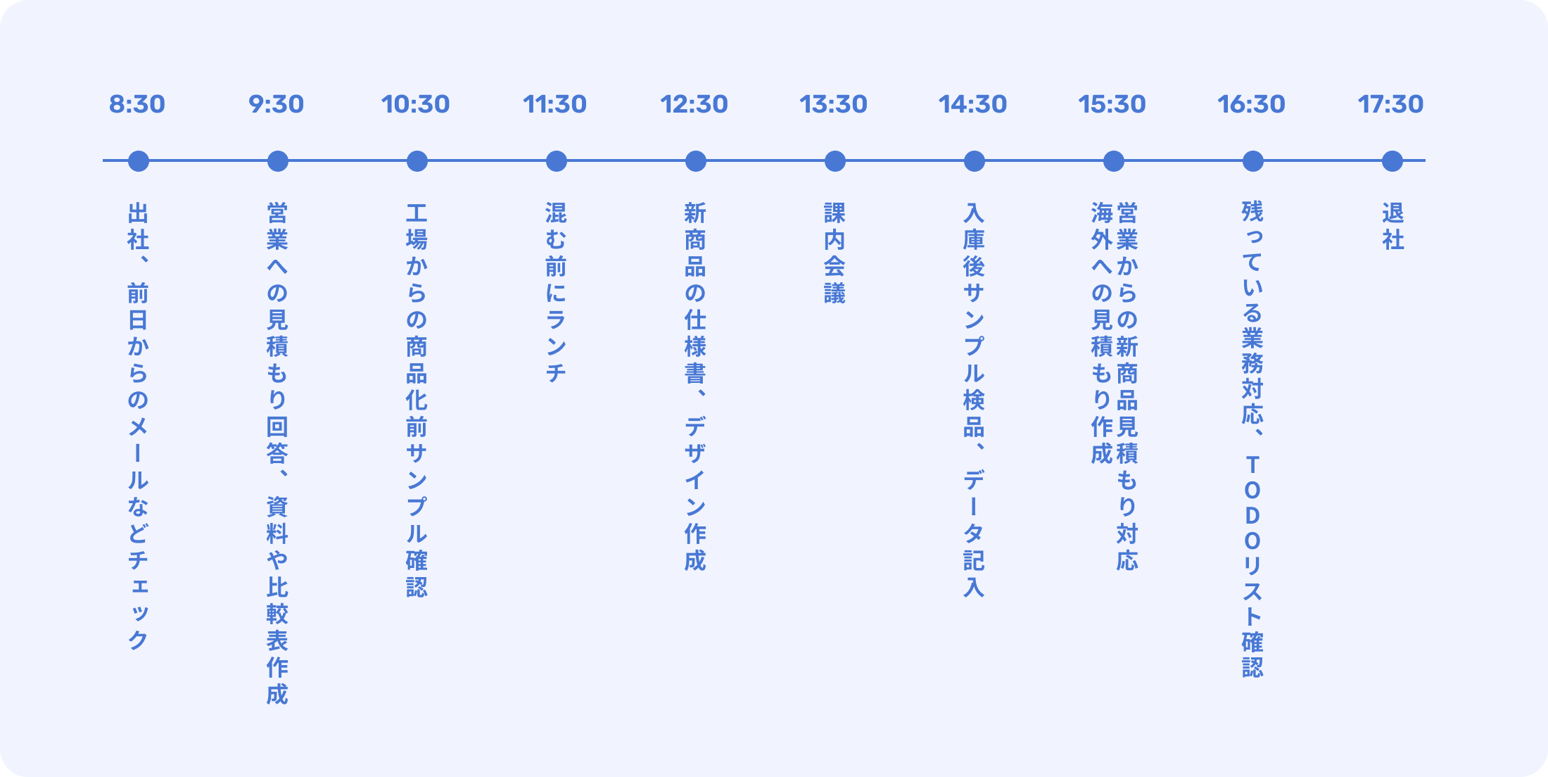 私は商品開発課と環境戦略推進本部を兼任しています。商品開発課は、国内外の展示会における新素材の情報収集、商品製造の手配から完成までを手掛けるポジションです。具体的には、営業から上がってきた見積もり依頼に基づいて海外にある工場と調整し、商品の製造が決まった場合は、仕様確認やサンプルの確認などを経て商品の出来上がりまで携わります。