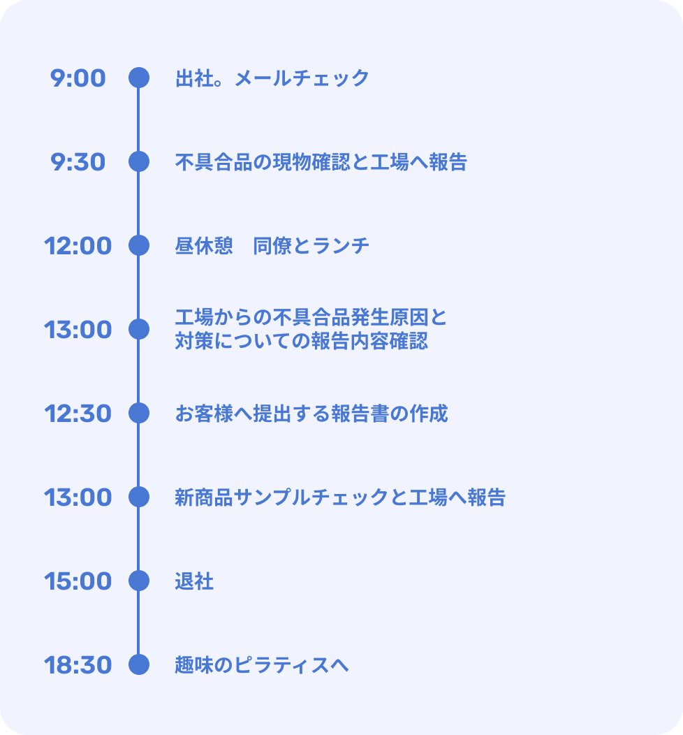 1日の業務はメールチェックから始まり、届いている連絡によってその日にすべきことが決まるため、都度、優先順位をつけて取り組んでいます。特に、提出期限のあるご指摘対応、入庫日が決まっている新商品のサンプルチェックは緊急度の高いタスクです。勤務時間の7時間を効率的に使うために、それらの作業は、効率を上げやすい午前中に行うようにしています。お客様のお申し出の重要度によっては、必要に応じて残業が発生しますが、基本的に個人の裁量に委ねられています。また、出張などを除いて、私の部署では休日出勤がほとんどないため、ワークライフバランスが取りやすいですね。