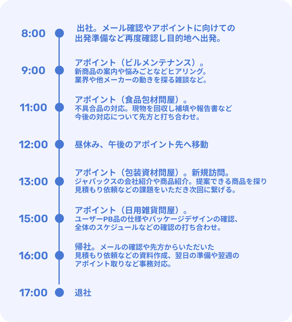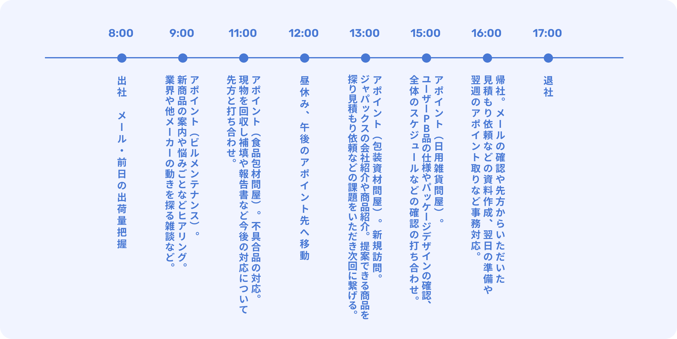 働き方も、自分の裁量でスケジュールを決めて進められるため、オンとオフのメリハリをつけやすいですね。また、周りの先輩方は長く働かれている方が多いのに加え、新しい情報や新商品のアイデアなど、常にアンテナを張っていらっしゃる方が多く、日々勉強になります。お酒好きな方もいれば、アニメ好きな方、海外旅行が趣味という方もいらっしゃり、個性豊かなメンバーが揃っている印象です。そして、何より親切な方が多いですね。